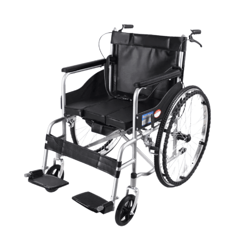 Fauteuil roulant avec fonction garde-robe, revêtement en bâche imperméable, équipé d’un seau hygiénique.